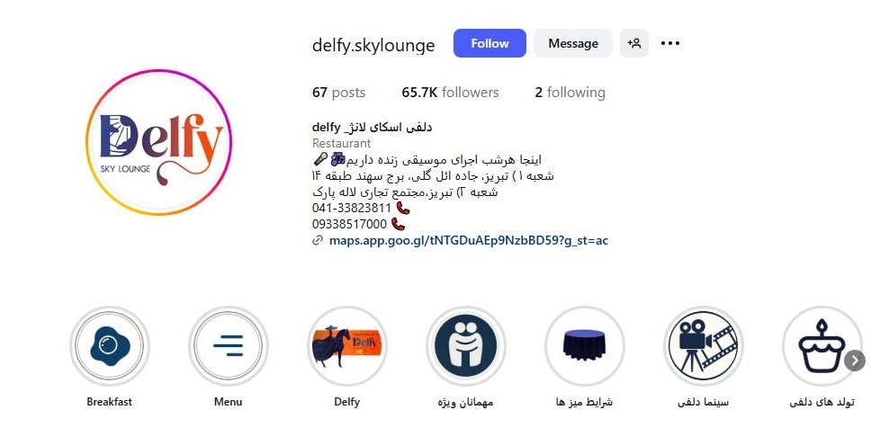 | رستوران دلفی اسکای لانژ | مدرن، چشمانداز شهری، مناسب خانوادگی و دوستانه | موسیقی زنده | انواع غذاهای ایرانی و بینالمللی | مناسب میهمانیهای کوچک و خانوادگی | محیط شیک و آرام، چشمانداز زیبا | شعبه اول: تبریز، جاده ائلگلی، برج سهند، طبقه 14؛ شماره تماس: 04133823811 / 09338517000 |
